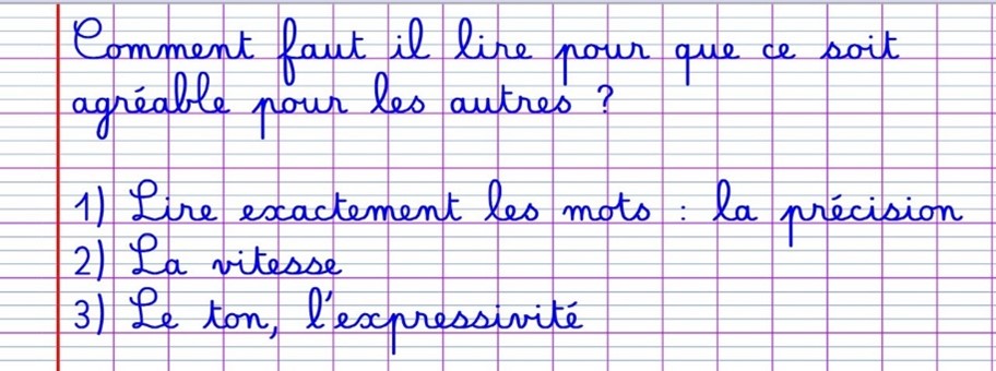 Tous les vendredis, nous faisons des ateliers de lecture avec la maîtresse et l’enseignante spécialisée. Lors de la première séance, nous avons déterminé les critères d’une bonne lecture. Puis chaque semaine, nous travaillons sur les 3 points importants que nous avons ciblés : la précision, la vitesse et l’expressivité.