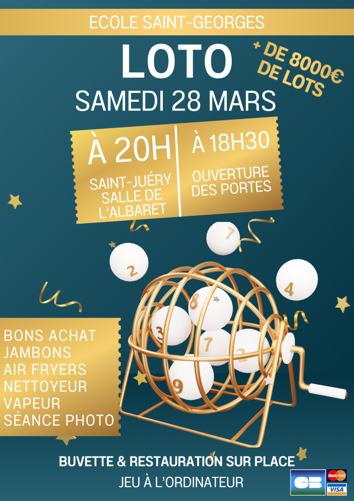 Nous avons le plaisir de vous rappeler que notre grand loto de lâĂ©cole se tiendra le samedi 28 mars.